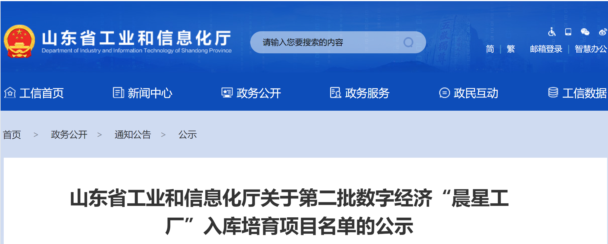 近日,山东省工信厅发布《关于第二批数字经济“晨星工厂”入库培育项目名单的公示》。