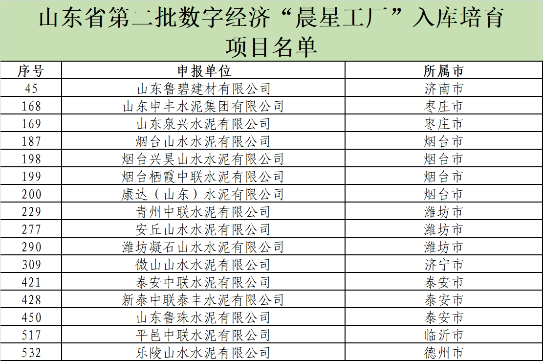 其中:山东鲁碧建材有限公司、山东申丰水泥集团有限公司、山东泉兴水泥有限公司、烟台山水水泥有限公司、烟台兴昊山水水泥有限公司、烟台栖霞中联水泥有限公司、康达(山东)水泥有限公司、青州中联水泥有限公司、安丘山水水泥有限公司、潍坊凝石山水水泥有限公司、微山山水水泥有限公司、泰安中联水泥有限公司、新泰中联泰丰水泥有限公司、山东鲁珠水泥有限公司、平邑中联水泥有限公司、乐陵山水水泥有限公司入选数字经济“晨星工厂”入库培育项目名单。