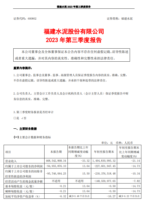 10月24日晚间,塔牌集团、福建水泥、山水水泥三家水泥上市公司披露前三季度业绩。其中塔牌水泥业绩同比大增487.3%,福建水泥亏损2.30亿元,山水水泥亏损1.88亿元。