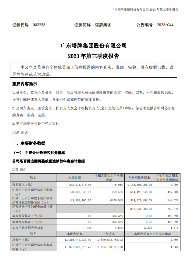 塔牌集团10月24日公告,公司前三季度营业收入41.16亿元,同比增长0.09%;归母净利润6.14亿元,同比增长487.3%;基本每股收益0.53元。2023年1-9月,公司实现水泥销量1,246.62万吨、熟料销量73.06万吨,较上年同期分别上升了2.80%、7.33%;公司实现营业收入411,610.61万元,较上年同期基本持平;受益于煤炭采购价格同比下降22.79%等影响,公司水泥销售成本同比下降,主业盈利水平同比有所提升;同时得益于股指回升的影响,公司非经常性损益同比大幅上升;叠加影响下,公司实现归属于上市公司股东的净利润61,442.86万元,较上年同期大幅上升了487.30%。