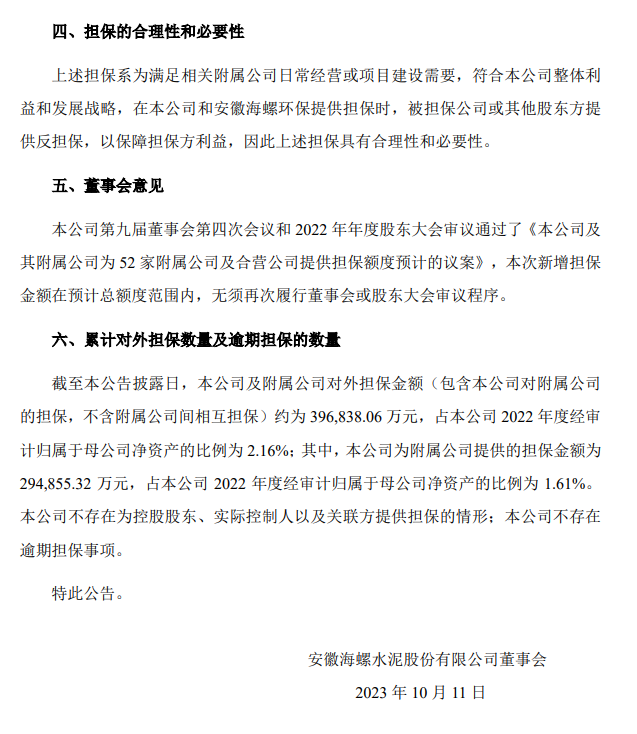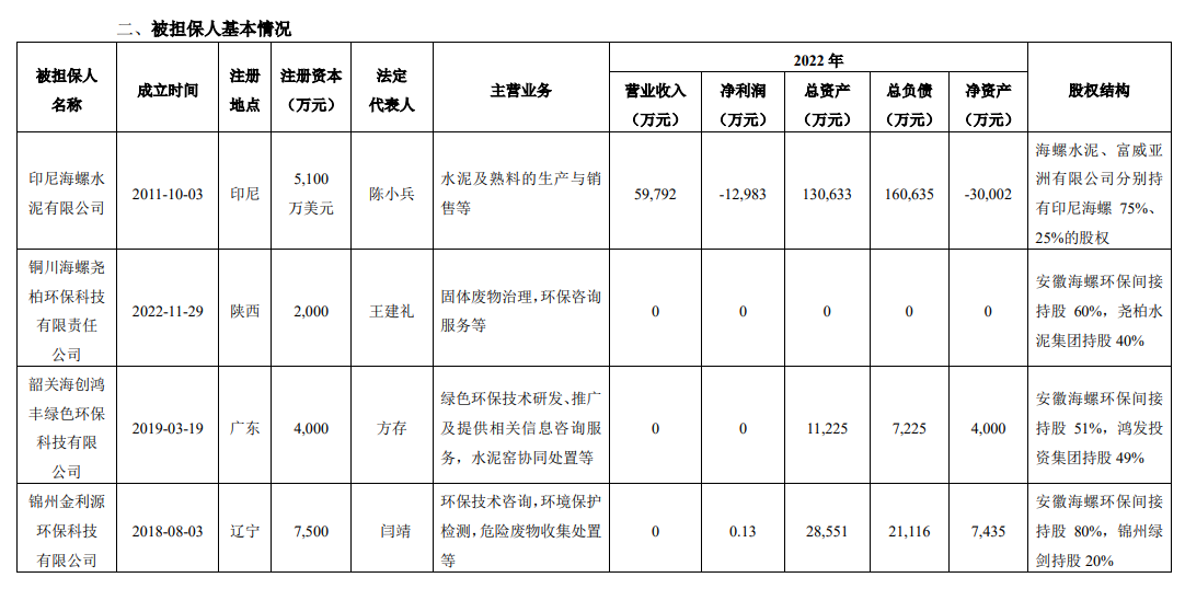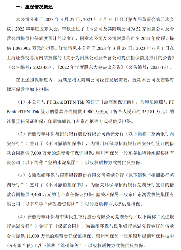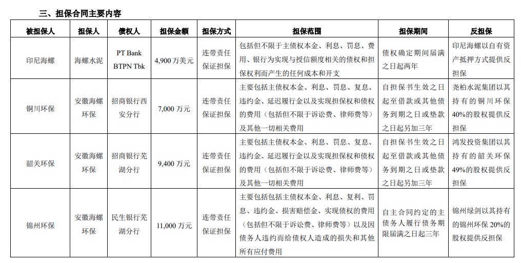 海螺水泥公告,公司及附属公司安徽海螺环保集团有限公司合计为印尼海螺水泥有限公司、铜川海螺尧柏环保科技有限责任公司、韶关海创鸿丰绿色环保科技有限公司、锦州金利源环保科技有限公司等附属公司提供的担保金额为62,581万元。