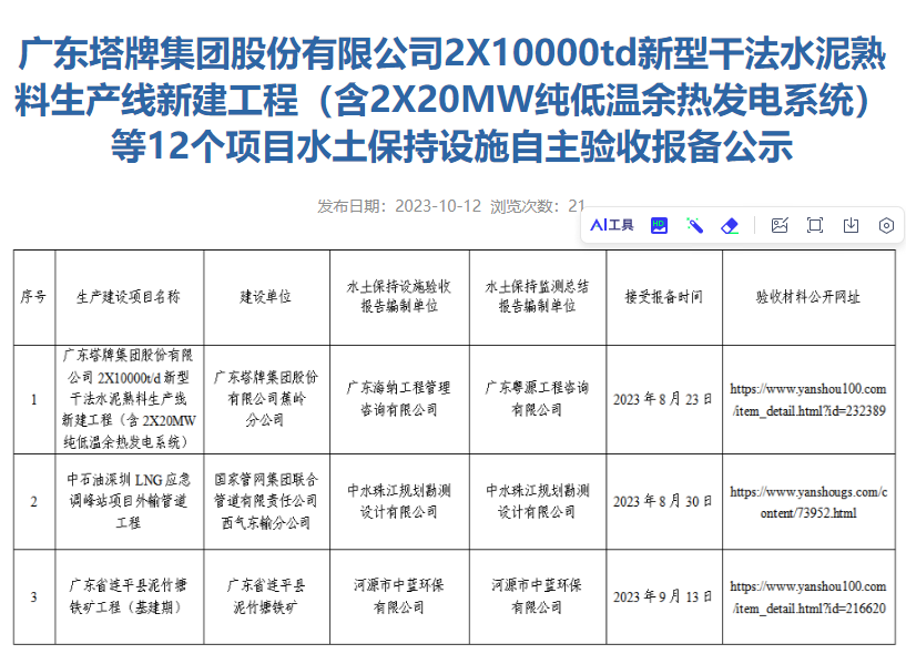 10月12日,广东省水利厅公布广东塔牌集团股份有限公司2X10000td新型干法水泥熟料生产线新建工程(含2X20MW纯低温余热发电系统)等12个项目水土保持设施自主验收报备公示。