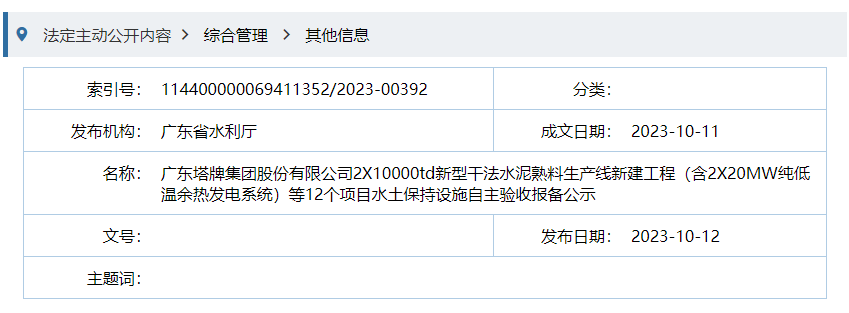 10月12日,广东省水利厅公布广东塔牌集团股份有限公司2X10000td新型干法水泥熟料生产线新建工程(含2X20MW纯低温余热发电系统)等12个项目水土保持设施自主验收报备公示。