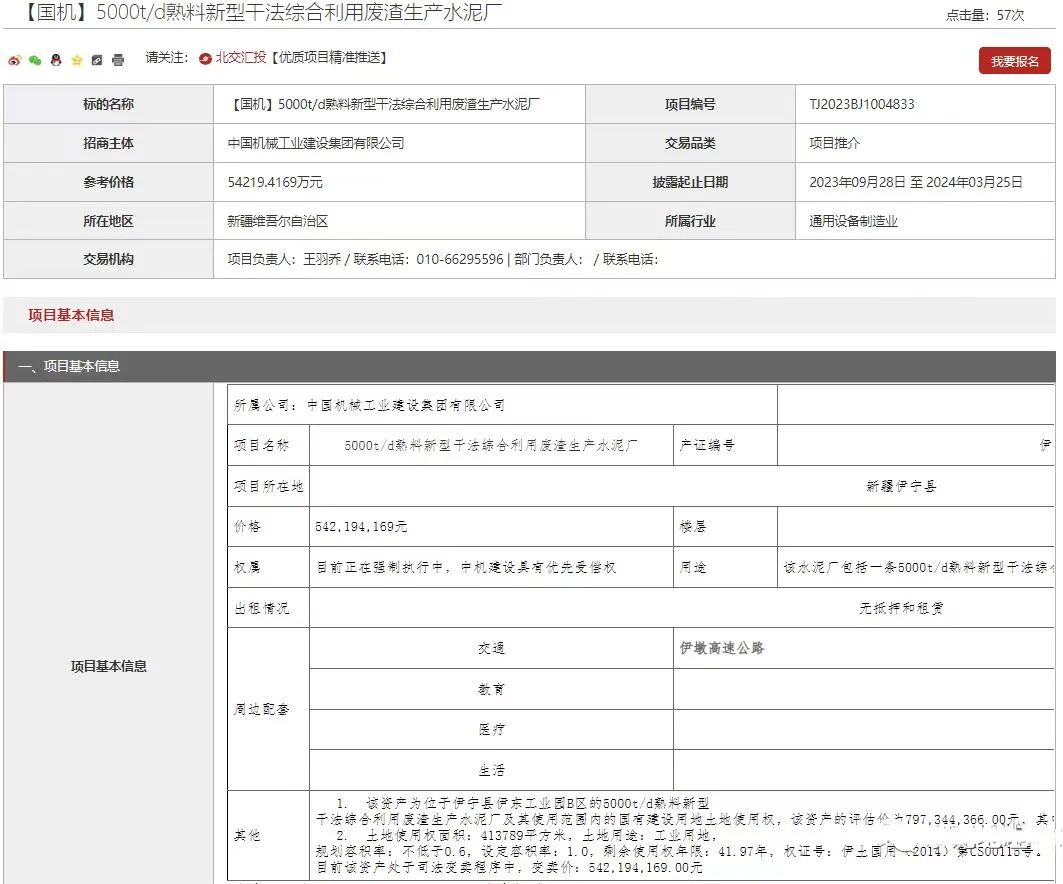 近日,据某产权交易平台消息,中国机械工业建设集团有限公司所属5000t/d熟料新型干法综合利用废渣生产水泥厂目前正在司法变卖程序中,变卖价:54219.4169万元。项目目前正在强制执行中,中机建设具有优先受偿权。