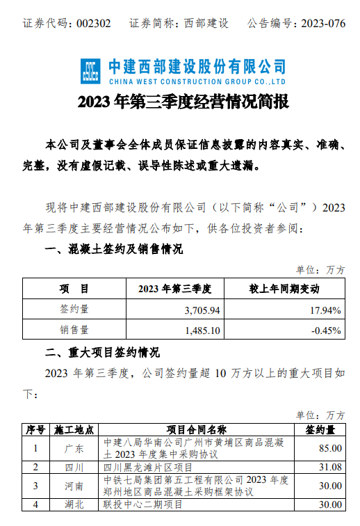 10月18日午间,西部建设发布2023年第三季度经营情况简报显示,公司2023年第三季度混凝土签约量为3705.94万方,同比增长17.94%;销售量1485.10万方,同比减少0.45%。