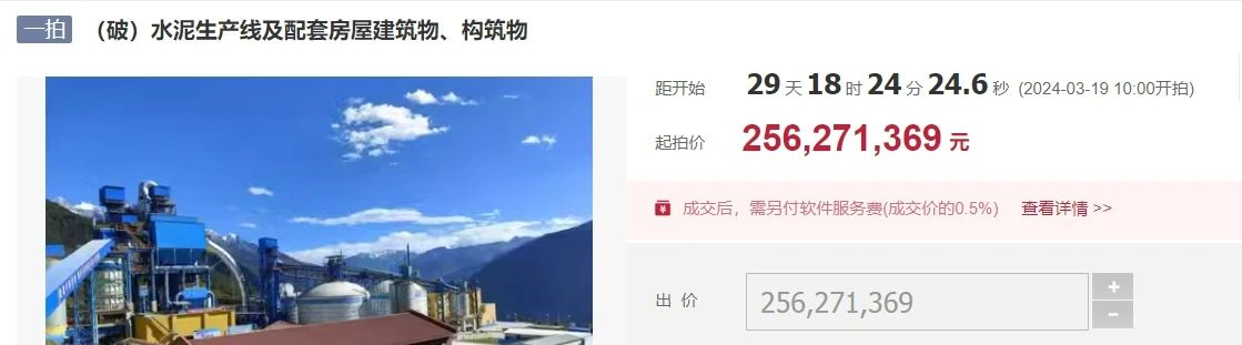 近日,康定跑马山水泥有限责任公司整套水泥生产线及配套房屋建筑物、构筑物整体拍卖,包含配套机械设备、房屋等建筑物和构筑物、水泥生产线相关设施、设备等。起拍价为256,271,369元。