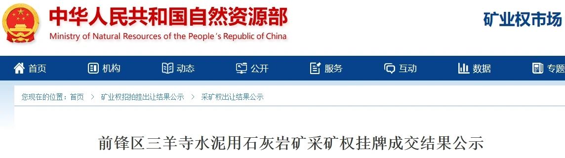 近日,四川省广安市自然资源和规划局发布前锋区三羊寺水泥用石灰岩矿采矿权挂牌成交结果公示,四川省广安桂兴水泥有限公司以5900万元竞得该采矿权。