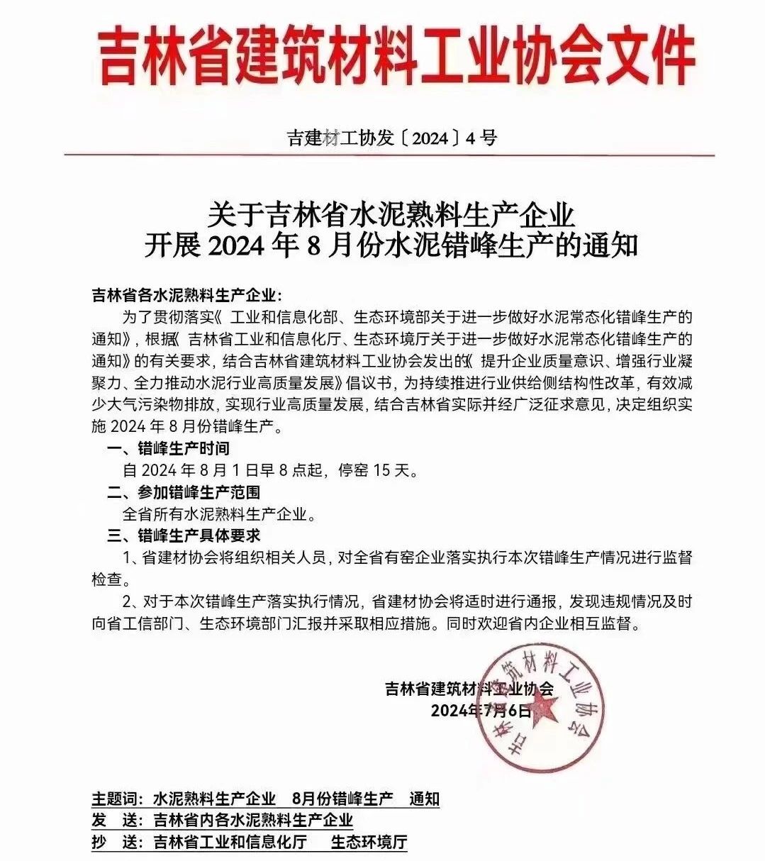 7月6日,吉林省建筑材料工业协会发布《关于吉林省水泥熟料生产企业开展 2024年8月份水泥错峰生产的通知》自2024年8月1日早8点起,全省所有水泥熟料生产企业,停窑15天。