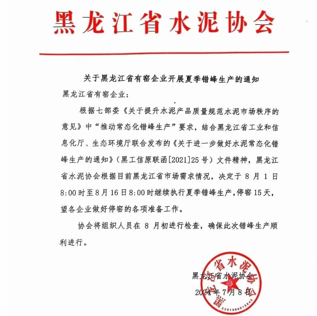 7月8日,黑龙江水泥协会发布《关于黑龙江省有窑企业开展夏季错峰生产的通知》,决定于8月1日8:00时至8月16日8:00时,全省有窑水泥企业,继续执行夏季错峰生产,停窑15天。