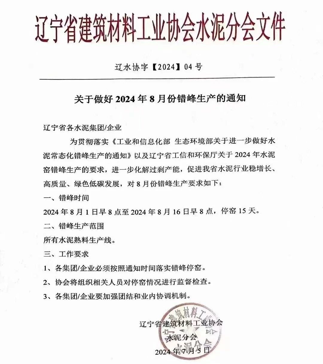 7月5日,辽宁省建筑材料工业协会水泥分会发布《关于做好2024年8月份错峰生产的通知》所有水泥熟料生产线,2024年8月1日早8点至2024年8月16日早8点,停窑15天。