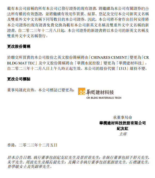 12月5日,华润建材科技控股有限公司发布公告《更改公司名称、股份简称及公司标志》。