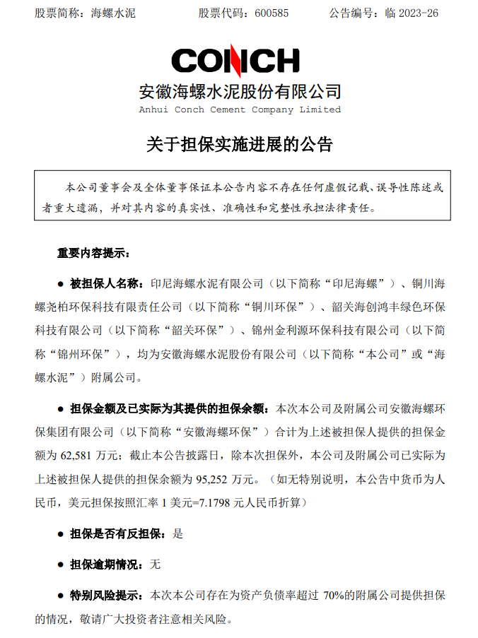 海螺水泥公告,公司及附属公司安徽海螺环保集团有限公司合计为印尼海螺水泥有限公司、铜川海螺尧柏环保科技有限责任公司、韶关海创鸿丰绿色环保科技有限公司、锦州金利源环保科技有限公司等附属公司提供的担保金额为62,581万元。