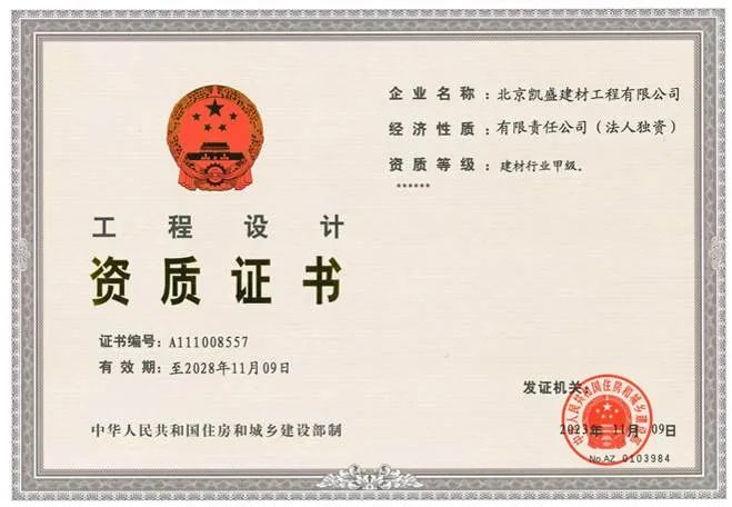 2023年11月9日,经中华人民共和国住房和城乡建设部核准,北京凯盛建材工程有限公司成功升级建材行业甲级设计资质。