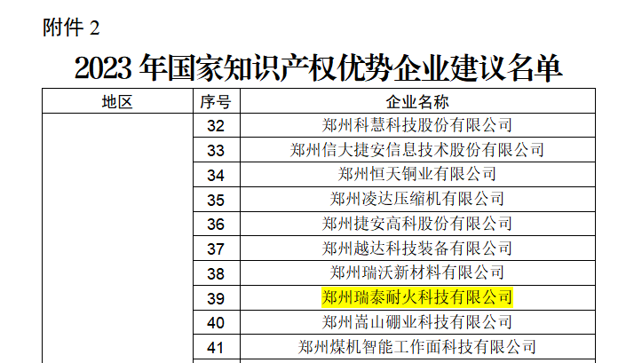 近日,国家知识产权局公布《关于2023年度国家知识产权优势企业和示范企业评定结果的公示》名单,郑州瑞泰耐火科技有限公司成功入选。