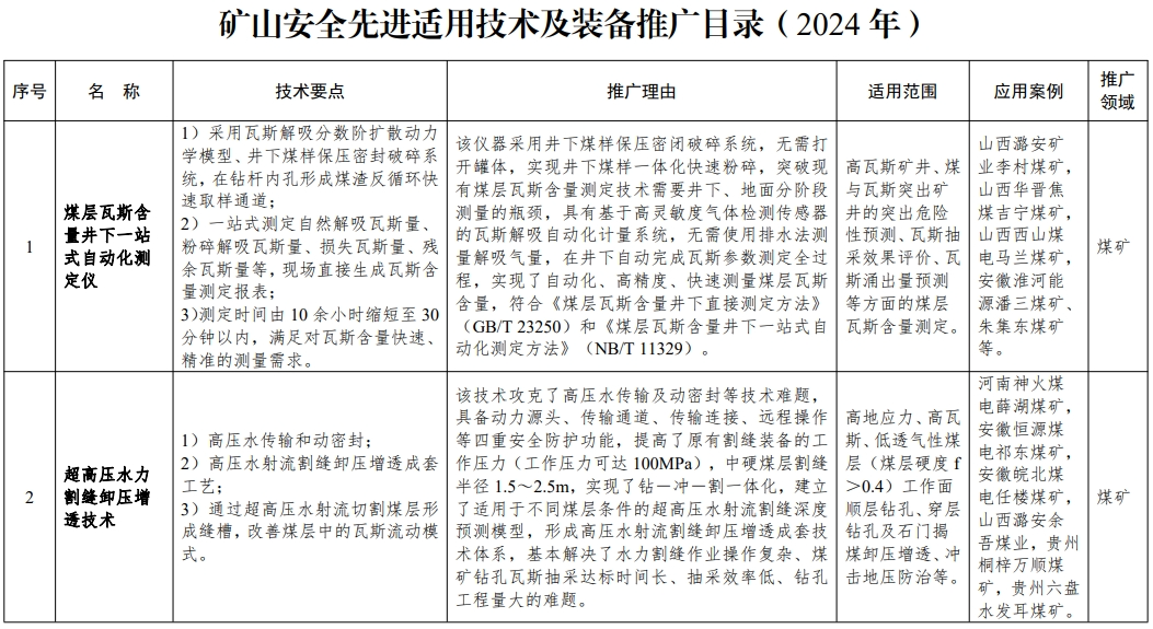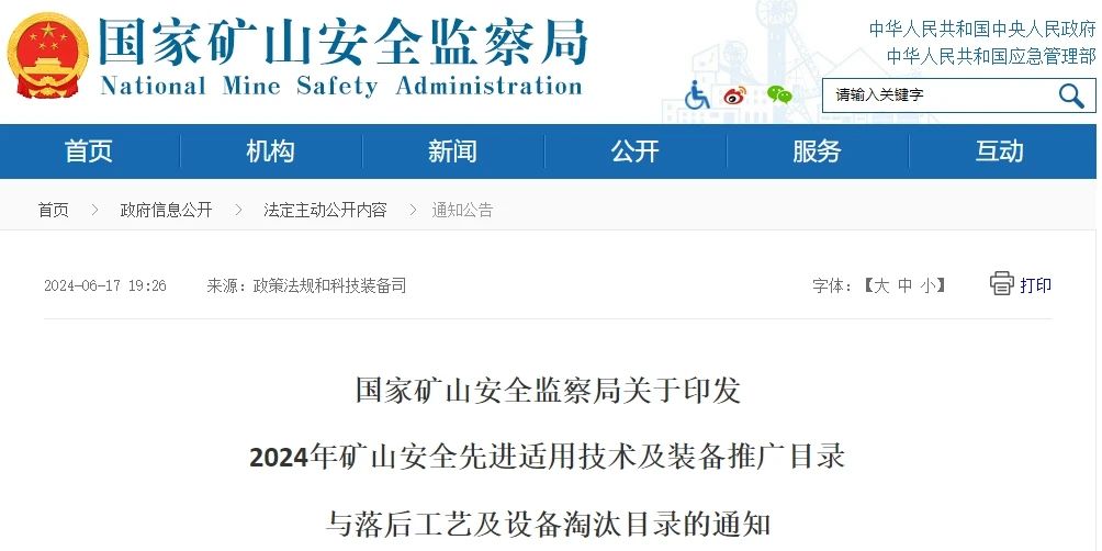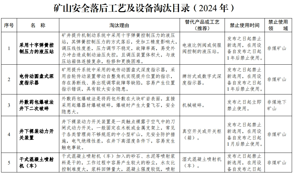 为持续增强矿山技术装备安全保障能力,推动矿山安全科技进步、装备升级和成果转化,依法淘汰严重危及生产安全的工艺及设备,预防矿山生产安全事故,近日,国家矿山安全监察局印发2024年矿山安全先进适用技术及装备推广目录与落后工艺及设备淘汰目录。