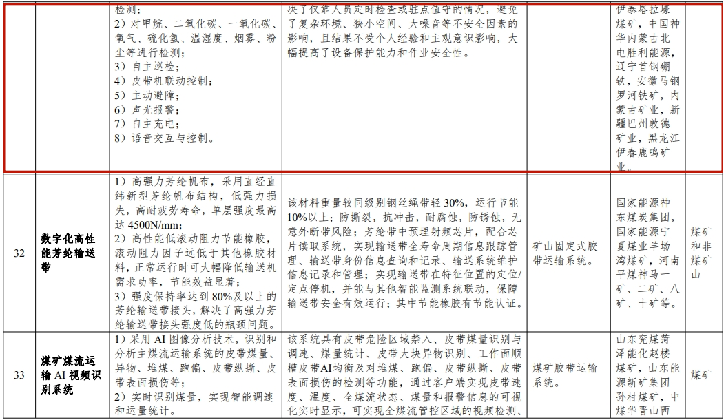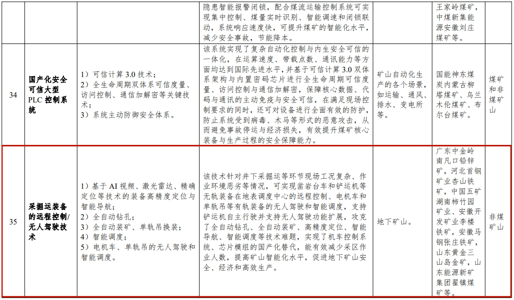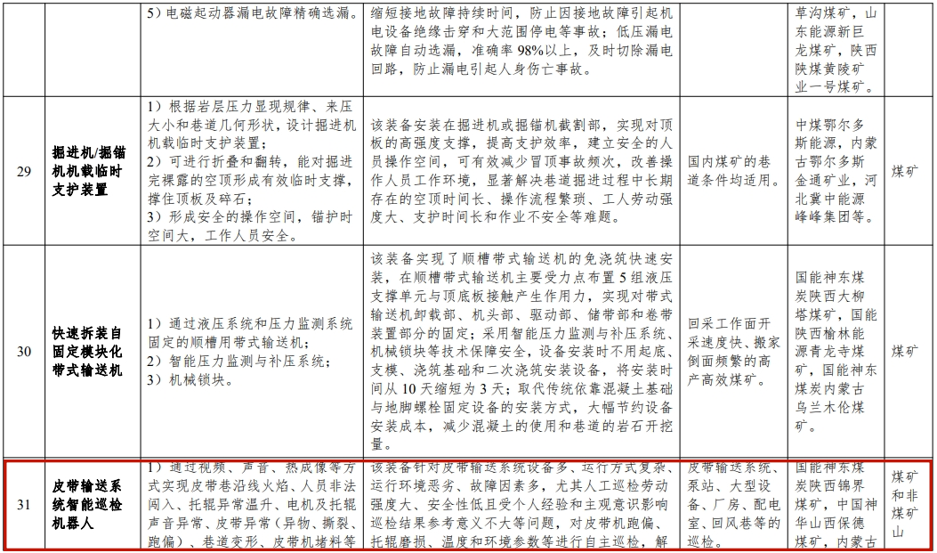 其中,皮带输送系统智能巡检机器人、采掘运装备的远程控制/无人驾驶技术等被列入矿山安全先进适用技术及装备推广目录(2024 年)。