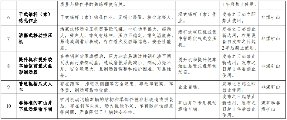 干式混凝土喷射机(车)、干式锚杆(索)钻孔作业、活塞式移动空压机等被列入矿山安全落后工艺及设备淘汰目录(2024 年)。