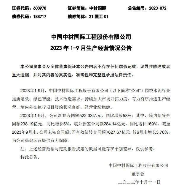 近日,中材国际发布2023年1-9月生产经营情况公告。2023年1-9月,中材国际围绕水泥行业提质增效、绿色智能、技术改造需求,持续加大市场开拓力度,有力有序推进生产经营,境内外在执行项目履约状况良好,经营业绩稳健。