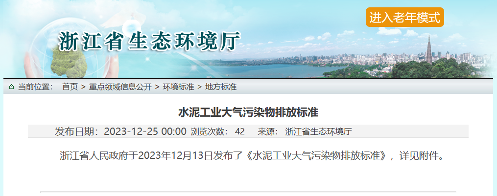 浙江省人民政府于2023年12月13日发布了《水泥工业大气污染物排放标准》,自2024年1月13日起施行。