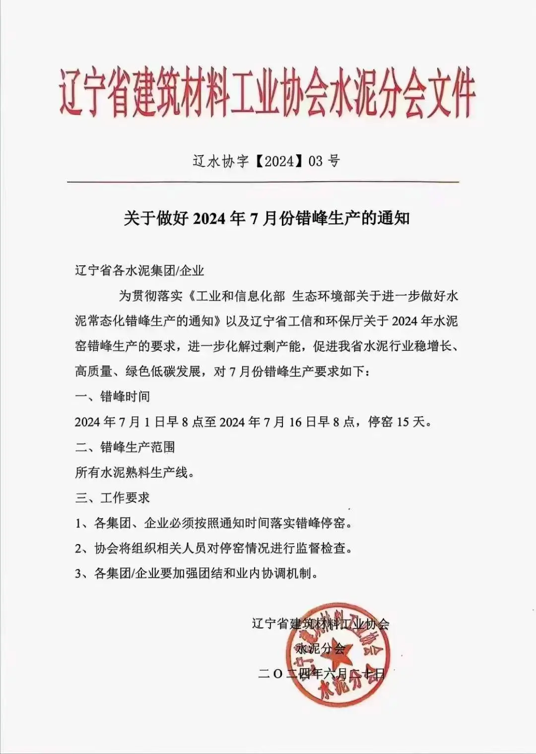 6月20日,辽宁省建筑材料工业协会水泥分会发布《关于做好2024年7月份错峰生产的通知》,要求所有水泥熟料生产线2024年7月1日早8点至2024年7月16日早8点,停窑15天。各集团、企业必须按照通知时间落实错峰停窑、协会将组织相关人员对停窑情况进行监督检查、各集团/企业要加强团结和业内协调机制。
