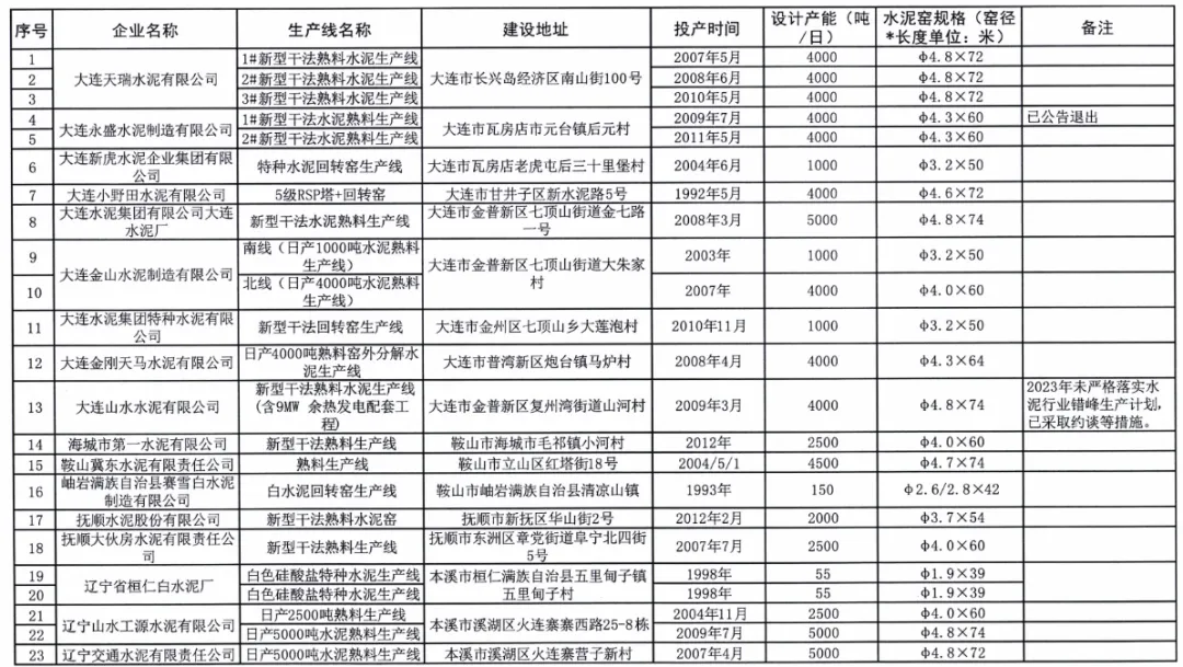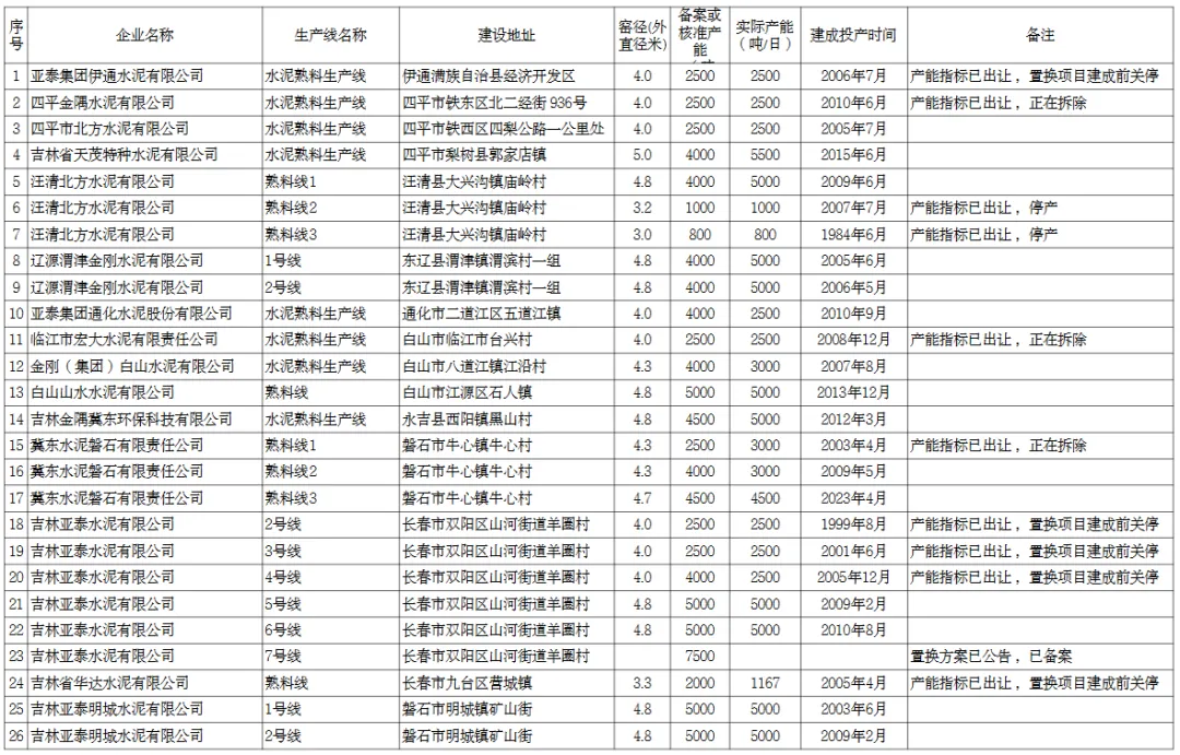 根据吉林省工信厅发布的《吉林省水泥熟料生产线清单》,截至2023年12月31日,吉林省共有16家水泥厂26条水泥熟料生产线,其中11条水泥熟料生产线已经进行了产能置换,2条停产,3条正在拆除,其余6条水泥熟料生产线在置换项目建成前关停。