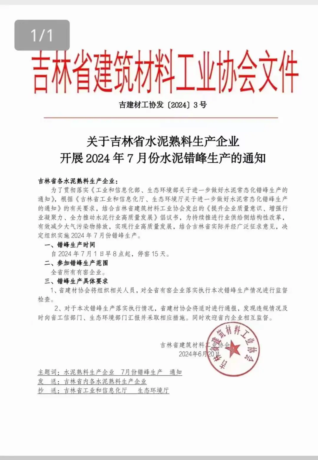 6月20日,吉林省建筑材料工业协会发布《关于吉林省水泥熟料生产企业开展2024年7月份水泥错峰生产的通知》称,决定组织实施2024年7月份错峰生产。要求全省所有有窑企业自2024年7月1日早8点起,停窑15天。省建材协会将组织相关人员,对全省有窑企业落实执行本次错峰生产情况进行监督检查;对于本次错峰生产落实执行情况,省建材协会将适时进行通报,发现违规情况及时向省工信部门、生态环境部门汇报并采取相应措施。
