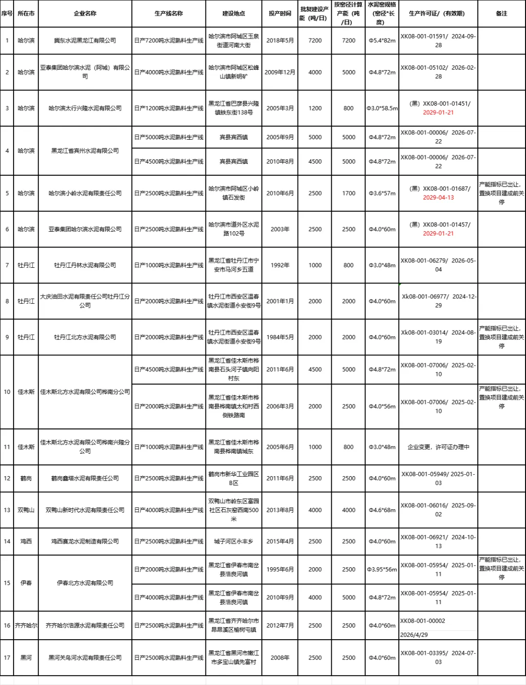 根据黑龙江省工信厅发布的《黑龙江省水泥熟料生产线清单》,截至2023年12月31日,黑龙江省共有17家水泥厂20条水泥熟料生产线,其中4条水泥熟料生产线已经进行了产能置换,在置换项目建成前关停。