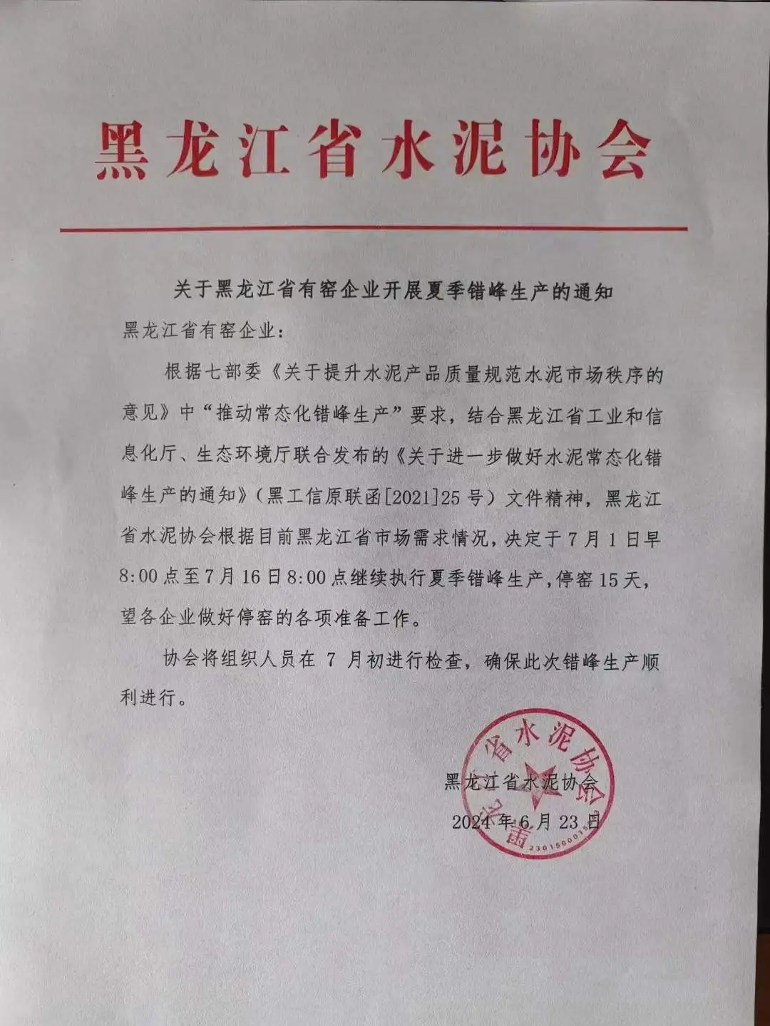 6月23日,黑龙江省水泥协会发布《关于黑龙江省有窑企业开展夏季错峰生产的通知》,要求黑龙江省有窑企业7月1日早8:00至7月16日8:00继续执行夏季错峰生产,停窑15天。协会将组织人员在7月初进行检查,确保此次错峰生产顺利进行。
