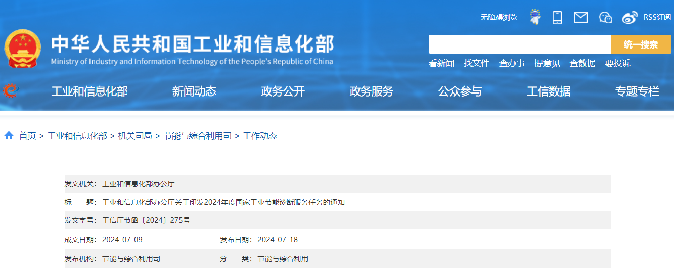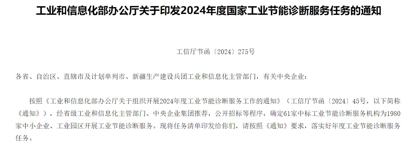7月18日,工信部发布《关于印发2024年度国家工业节能诊断服务任务的通知》称,按照相关文件要求,经省级工业和信息化主管部门、中央企业集团推荐,公开招标等程序,确定61家中标工业节能诊断服务机构为1980家中小企业、工业园区开展工业节能诊断服务。