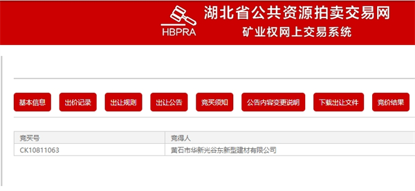 该项目位于湖北省黄石市开铁区铁山街道,主要采矿水泥用石灰岩和建筑石料用石灰岩。水泥用石灰岩储量为5856.5万吨,包括探明资源量894.0万吨、控制资源量2905.9万吨和推断资源量2056.6万吨;建筑石料用石灰岩推断资源量为546.4万吨,全部属于保有资源量。矿权出让期限为13年,年产能500万吨。竞得方为黄石市华新光谷东新型建材有限公司,出资1.43亿元竞得该项目。