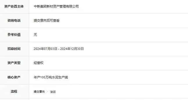 近日,据某交易平台显示,中国建材山东菏泽曹县100万吨水泥厂生产线经营权/资产(设备、厂房、土地、办公楼)整体出售,可股权出售,可资产出售,可经营权长期租赁。