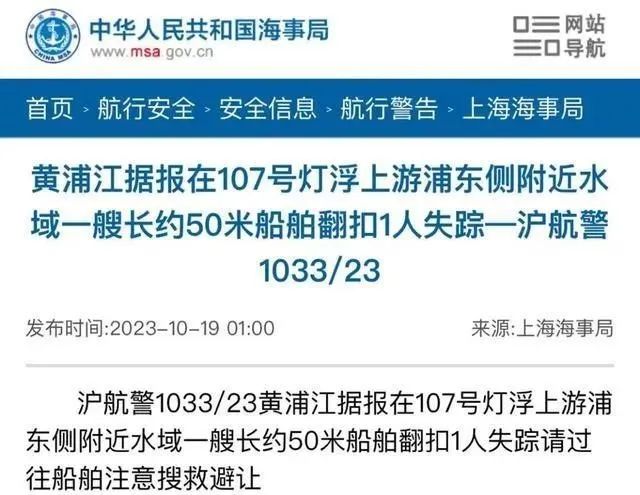 记者从上海海事局了解到,10月18日23时40分,黄浦江107号灯浮上游浦东侧附近水域,一艘长约50米的水泥运输船与一艘油船发生碰撞,导致水泥运输船翻扣,水泥运输船上1名船员在附近水域失踪。