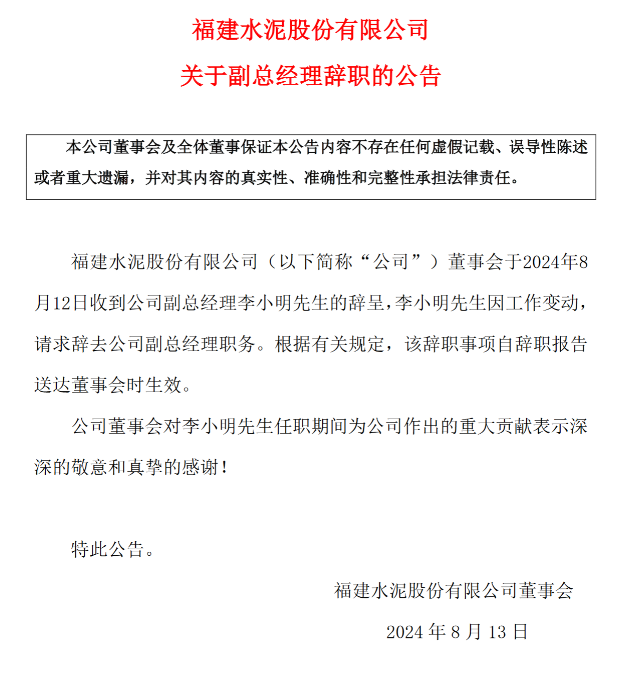 8月12日晚间,福建水泥发布公告称,公司董事会于2024年8月12日收到副总经理李小明先生的辞呈。